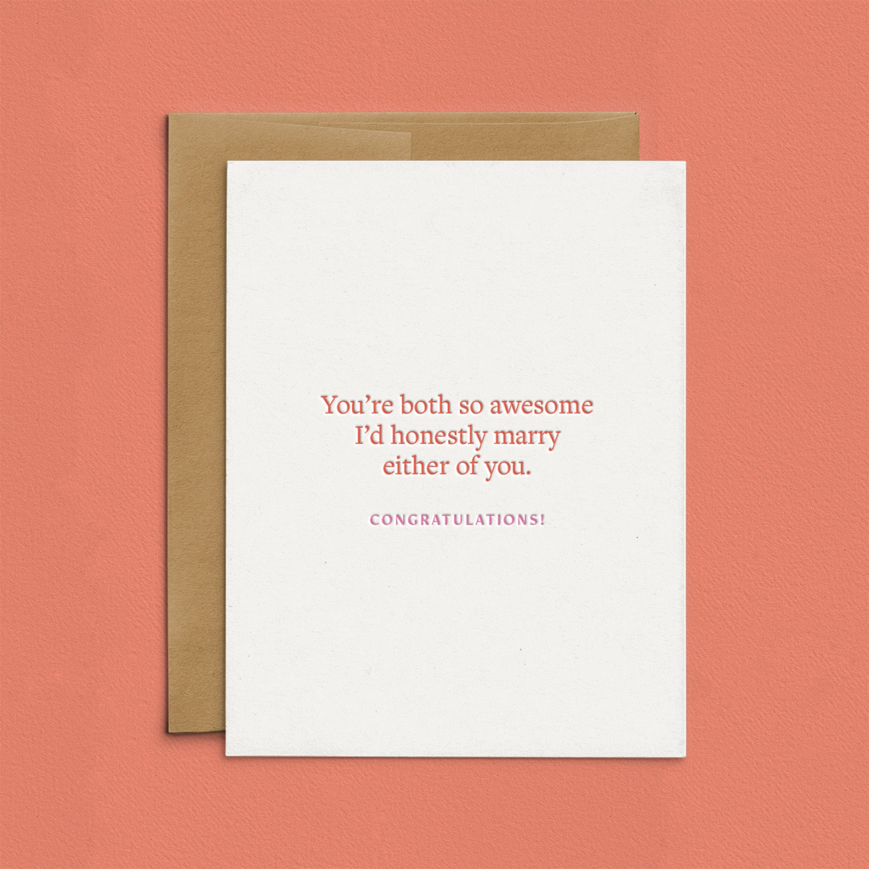 It's the perfect card for that couple everyone's just a tiny bit jealous of — they've got it all together, and now they've got each other. Send a hooray (and make them laugh) with this sweet message — and bonus, it works for either an engagement or for their "big day!"