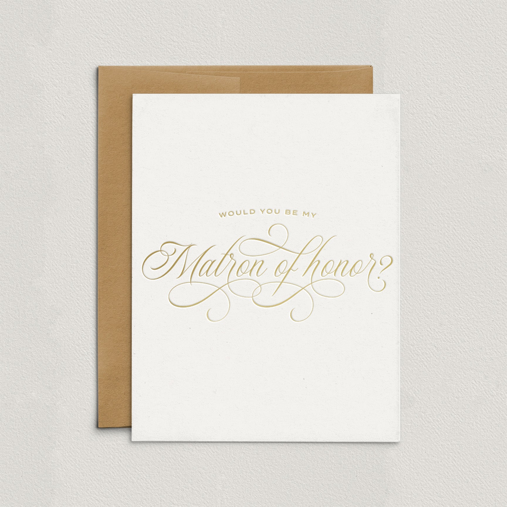 Ask someone very special to be your matron of honor with this shining champagne-gold foilstamped message. This card is sure to become a keepsake of a special moment between the two of you!